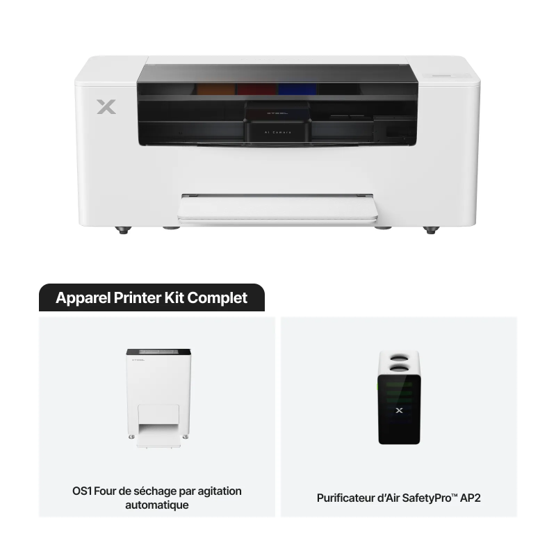 Créez votre atelier de marquage textile complet, sûr et productif avec le Studio DTF xTool. Cette solution tout-en-un associe la qualité d'impression de l'Apparel Printer, l'automatisation du four OS1, et la sécurité du purificateur d'air AP2 Safety Pro. Produisez des textiles personnalisés de qualité professionnelle dans un environnement de travail sain, en éliminant fumées et odeurs. Idéal pour les entrepreneurs, ateliers et établissements scolaires exigeant performance et sécurité