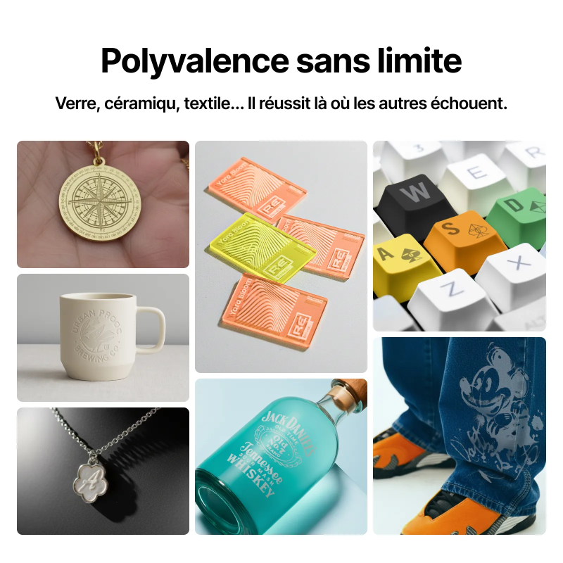 | Matériaux Compatibles | Verre, Cristal, Céramique, Plastiques techniques (PC, ABS, PET, PVC), Silicone, Métaux revêtus/peints. |