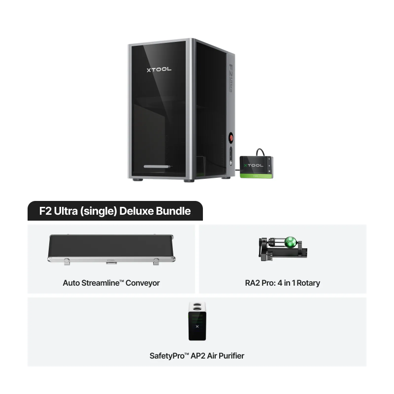 Le xTool F2 Ultra Pack Deluxe de xTool est une solution de gravure laser fibre professionnelle tout-en-un conçue pour les utilisateurs exigeants. Basé sur la technologie MOPA 60W, ce graveur permet la gravure profonde, le marquage haute précision et la gravure couleur sur acier inoxydable.
