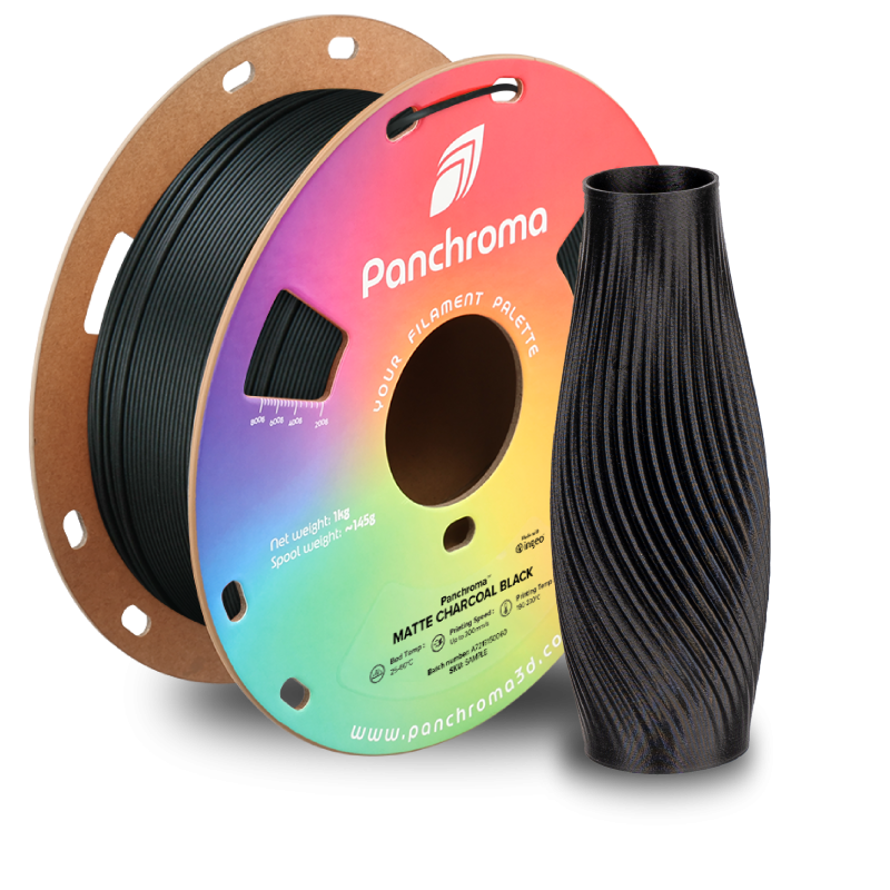 Découvrez le Filament Polymaker Panchroma™ PLA Matte Charcoal Black, un matériau d'impression 3D qui combine la facilité d'impression exceptionnelle du PLA avec une finition mate élégante et une couleur noir charbon profond et intense, évoquant la sobriété et la modernité.