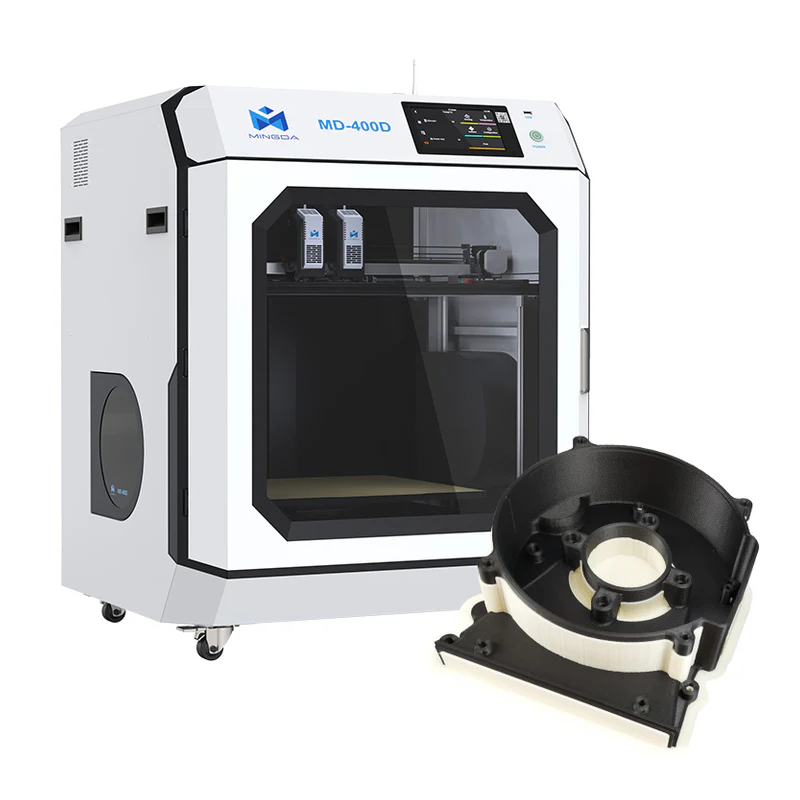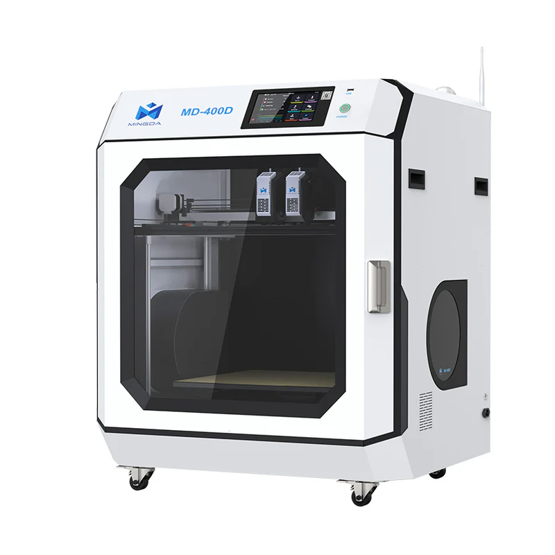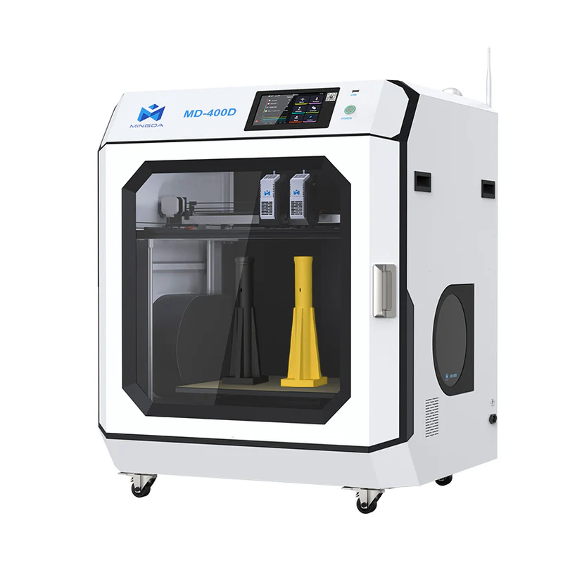 La Mingda MD-400D offre une flexibilité exceptionnelle avec ses deux extrudeuses indépendantes, permettant des impressions bicolores et bimatériaux. L'une des têtes se retire automatiquement pour éviter toute contamination, et les deux peuvent fonctionner simultanément pour doubler la productivité.