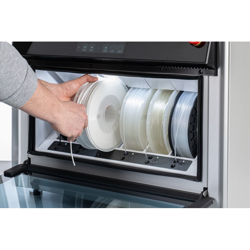 Ne vous souciez plus de la gestion des bobines de filament. Le système intégré de manutention automatique des matériaux de l'Ultimaker Factor 4 gère vos matériaux en toute sécurité, tout en maintenant la chambre interne à un niveau d'humidité optimal pour une qualité d'impression constante.