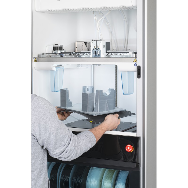 Construite pour résister aux rigueurs de l'environnement industriel, l'Ultimaker Factor 4 est dotée d'une chambre de construction triplement isolée et d'une extrusion double directe. Cette conception robuste garantit une production constante, même sur des conceptions complexes, tout en maintenant la qualité du filament grâce à un système de gestion automatisé des matériaux.